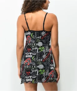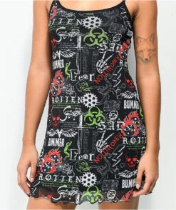 Scare the neighbors in the Vitriol Lyra black mesh tank top dress! This sinister dress has a mesh construction, giving it loads of breathability and a unique look, while the elastic straps offer comfort and stability. The entire dress is sublimated with a collage of disturbing, ghoulish graphics and texts, for example: toxic signs, spider webs, skulls, and words like “Rotten” and “Fear.” Now you can adorn yourself in Halloween-inspired garb regardless of season.