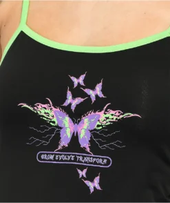 The Ryah Vitriol bodycon dress has a slim, form-fitting silhouette, and has thin, lime-green shoulder straps. This Vitriol dress comes in a black colorway with a screen-printed butterfly and text on the chest that reads, “Grow, evolve, transform.” Made from breathable, lightweight cotton and stretchy spandex, this dress will comfortably move with you; plus, with its minimal design, it’s great for layering.