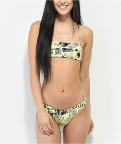 The Your Highness bandeau bikini top has thin, adjustable shoulder straps and padded chest. The Scribble bikini top is made from a comfortable, quick-drying blend of poly-spandex, and comes in a yellow colorway with sublimated graphics and text throughout, like yin-yang signs and “Wake ‘n’ bake.”